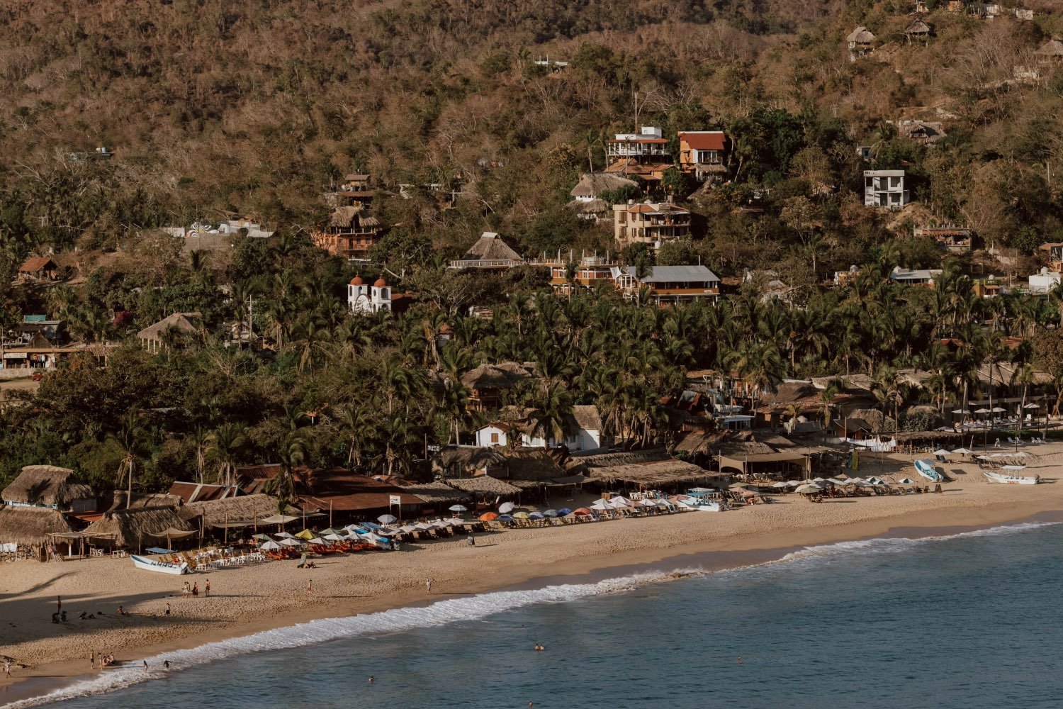 To the right, there are a handful of traditional restaurants with wooden loungers and tables to rent on the beachfront. These are popular with vacationing Mexicans and weekending locals, and ideal for a full day at the beach.